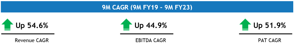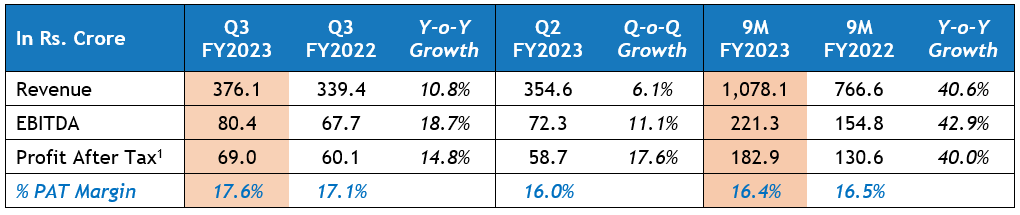 Delivered sequential revenue growth of 6.1% and PAT growth of 17.6% in Q3 FY2023 For 9M FY2023: Revenue growth of 40.6% y-o-y | PAT growth of 40.0% y-o-y