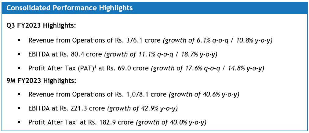 For 9M FY2023, consolidated revenue from operations was at Rs. 1,078.1 crore, an increase of 40.6% y-o-y. EBITDA was at Rs. 221.3 crore, an increase of 42.9% y-o-y. PAT up by 40.0% y-o-y to Rs. 182.9 crore. This growth was well-balanced across the three quarters of FY2023.