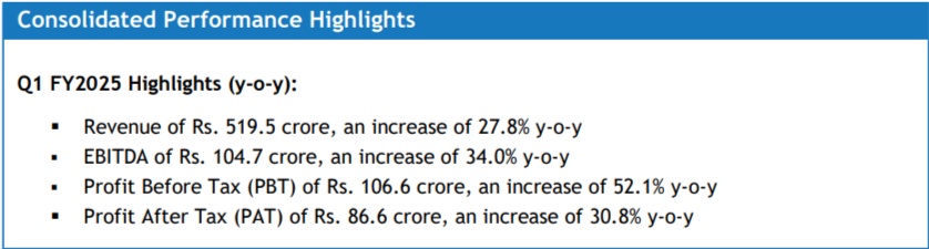 Affle reported a strong performance for Q1 FY2025 with a consolidated revenue from operations of Rs. 519.5 crore, an increase of 27.8% y-o-y from revenue of Rs. 406.6 crore in Q1 last year. EBITDA stood at Rs. 104.7 crore, an increase of 34.0% y-o-y. EBITDA margin stood at 20.1%, an increase of 93 basis points on a y-o-y basis. PAT increased by 30.8% y-o-y to Rs. 86.6 crore from Rs. 66.2 crore in Q1 last year. PAT margin stood at 15.9% in Q1 FY2025. This growth was broad-based coming across India and International markets.