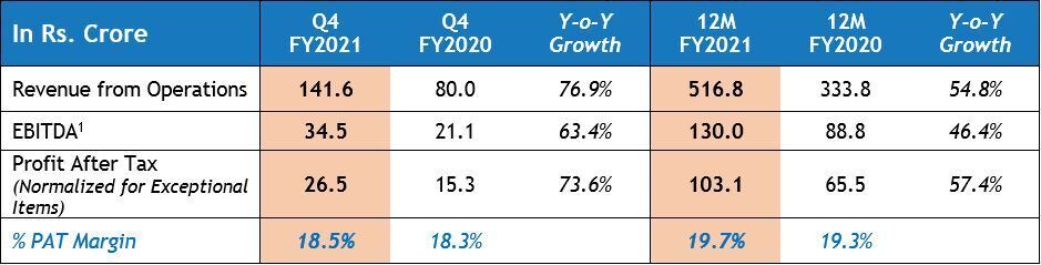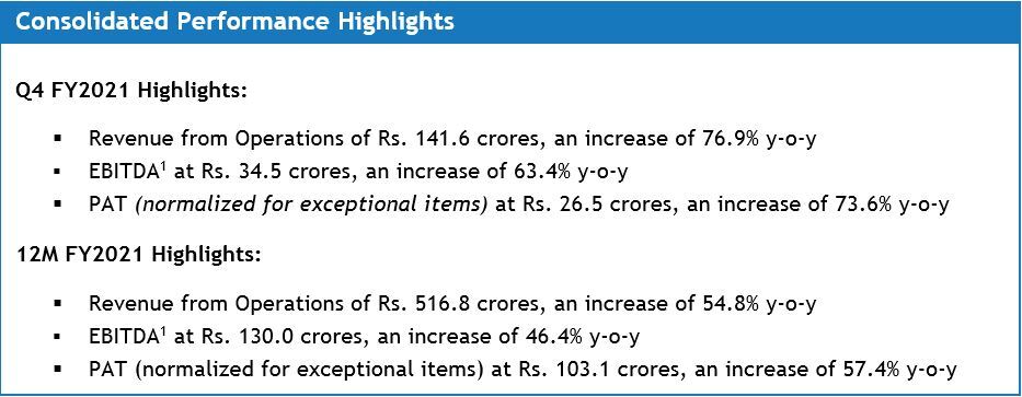 For 12M FY2021, consolidated revenue from operations was at Rs. 516.8 crores, an increase of 54.8% y-o-y from Rs. 333.8 crores in 12M last year. EBITDA was at Rs. 130.0 crores, an increase of 46.4% y-o-y. PAT (normalized for exceptional items) increased by 57.4% y-o-y to Rs. 103.1 crores and PAT margin expanded by 0.4%. The company reported robust operating cash flows of Rs. 101.6 crores, an increase of 41.4% y-o-y.
